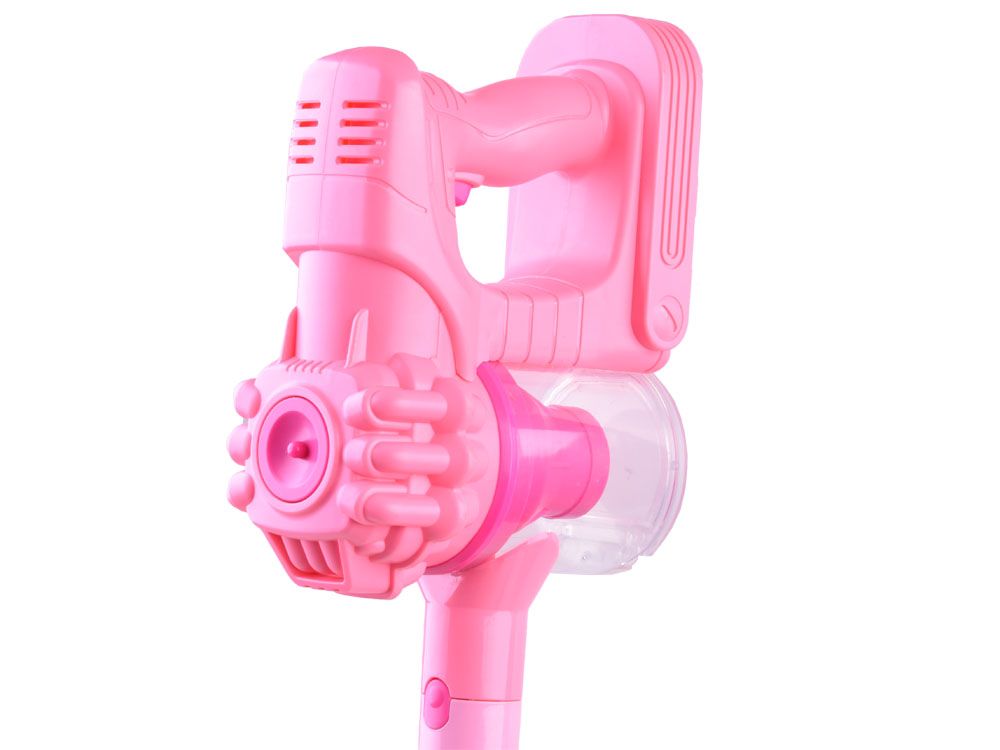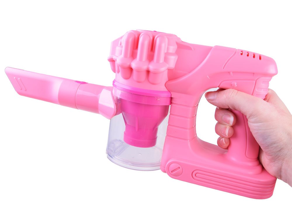 Set je v celoti izdelan iz plastike v elegantni róż barvi. Igrača ima dva zamenljiva koncaój, ob uporabi se osvetli z barvno lučko. Vedro za prah je mogoče odpreti, zato lahko iz njega izlijete zataknjene smeti.