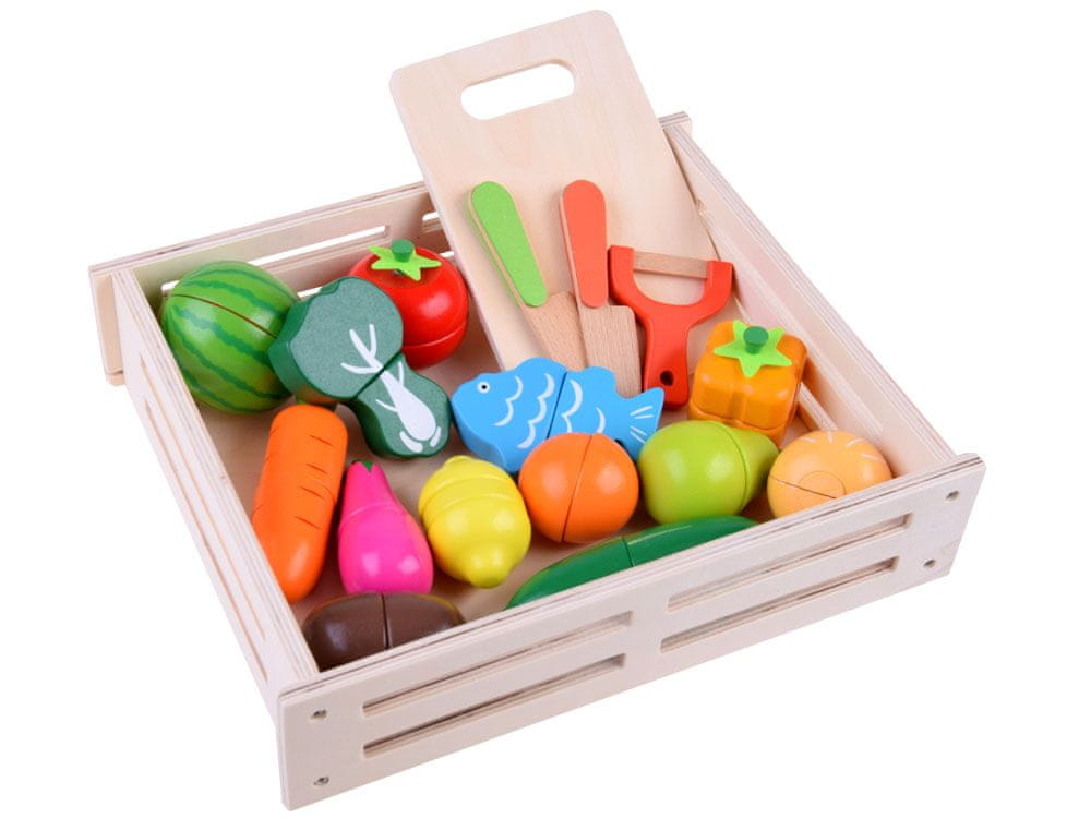 drevesna zelenjava in sadje za rezanje v naravni škatli z desko za rezanje in varnostnimi noži. Ta komplet naravno razmnožene zelenjave, sadjaów in rib bo poskrbel za kulinarično revolucijo. Otroci radi posnemajo odrasle in njihove vsakodnevne dejavnosti, zato je ta komplet kos takšnim izzivom. Sadje in zelenjava imata v svojih polovicah magnete, zaradi katerih ju je mogoče zlahka razcepiti, otrok pa lahko z njima razreže polovice in celo lubenico na četrtine. Odličen načinób za spodbujanje malih kuharjev k igri.