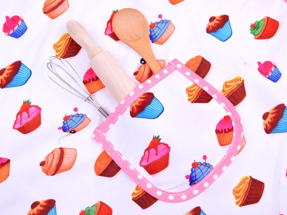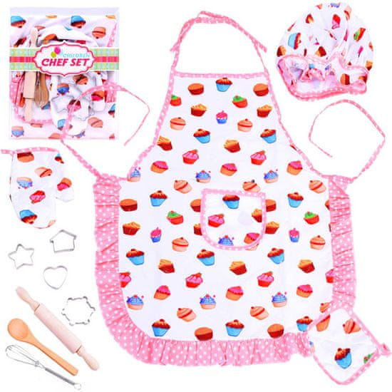 Set je sestavljen iz predpasnika, kuharske kape, rokavice in kuhinjskih pripomočkov (valjarja, žlice, kalupov za torte, metlic).