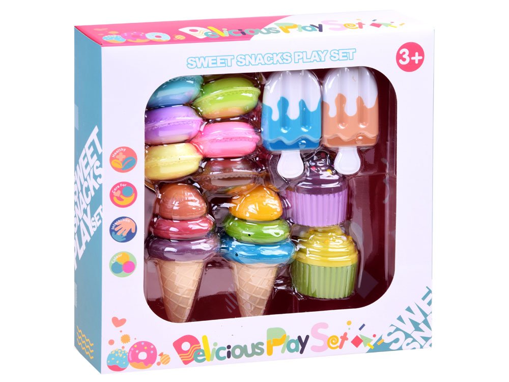Pestri set sladkih sladic v obliki sladkih piškotov in sladoledaów je predlog za zanimivo in privlačno igro za otroke. Komplet je v celoti izdelan iz plastike in je kot nalašč za kuhinjo vsakega malčka. Otroci pogosto radi pomagajo in opazujejo svoje staršeóv kuhinji ter jih pozneje pogosto posnemajo. Zahvaljujoč kompletu sladkarij bo naš otrok lahko gostil in postregel svoje punčke in medvedke s slastnimi torticami in sladoledom.
