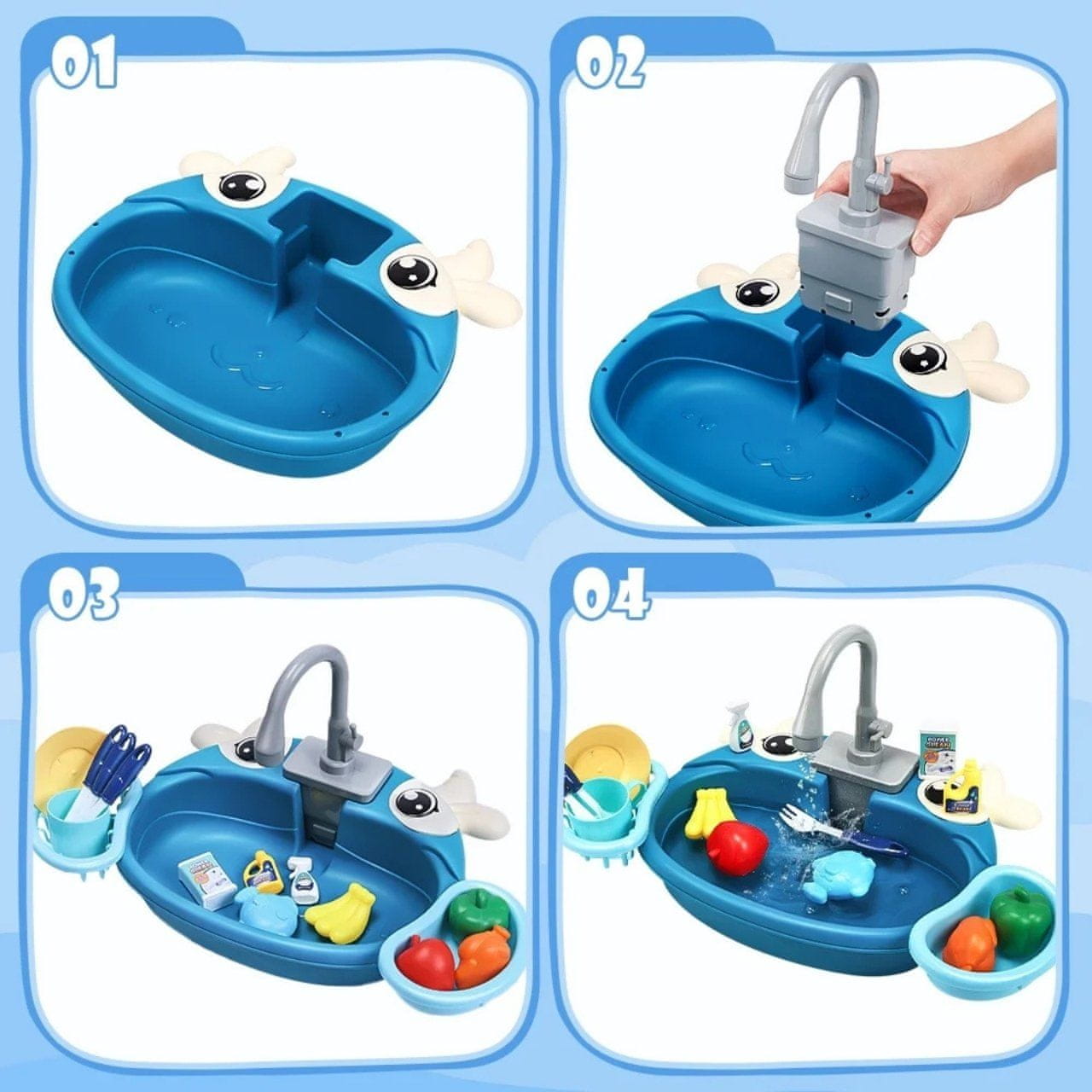 V Paketu: 1× otroški umivalnik s pipo, 1× komplet igračk