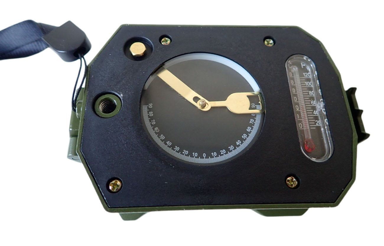 Odlična večnamenska ura v slogu ARMY ima odpiralni pokrov za zaščito kompasa, številne merilnike za hitre izračune razdalj na zemljevidu, tabelo za izračune razdalj z možnostjo merjenja višine horizonta in naklona terena, v kompas vgrajen termometer in ravnilo za nastavitev kompasa za natančne meritve. Instrument se uporablja za orientacijo na terenu, meri lahko razdaljo, višino, ravnost terena, naklon terena (kot nagiba), Bogata oprema buzzerja, namenjena različnim vrstam pomožnih meritev, služi za nemoteno navigacijo na neznanem terenu. Je profesionalno orodje za orientacijo in navigacijo. Z njim lahko natančno določite in ohranite pravo smer v gozdu, označite pot na zemljevidu in ocenite razdaljo med oddaljenimi predmeti. Kompas SBU09 je odlična izbira za različne vrste dejavnosti na prostem – za športnike, lovce, ribiče, nepremičninske agente, za vojaške namene ali pa za ljubitelje kampiranja in zahtevnih pohodov v naravi. Ta kompas je idealen za različne namene. Kompas ima zgornji pokrov s tečaji, v katerem je prozorno stekelce za pregledovanje. Tako lahko kompas uporabljate tudi z zaprtim pokrovom. Številčnica je v posebni tekočini, ki omogoča hitro uravnavanje magnetne puščice in natančno določanje pravilne smeri. S kompasom lahko določite azimut v stopinjah. Vgrajena je mehurčkasta niveleta, ki olajša poravnavo kompasa vzdolž vodoravne osi. Z iskalom lahko izostrite oddaljene predmete in določite azimut. Natančno vrednost lahko vidite skozi posebno lečo na skali na ohišju kompasa. V iskalu je skala v tisočinkah palca za merjenje razdalje med predmeti. Pri delu z zemljevidi se uporabljata dve merili: eno merilo je v centimetrih, drugo v palcih. Na spodnji strani merilnika je naprava za merjenje višinskih kotov in naklona terena, na voljo pa je tudi termometer. Osnovni parametri zvočnika: dimenzije buzole so 100 × 65 × 80 mm s pokrovom nad smerno puščico kompasa za določanje azimuta, prozorno iskalo z natančno orientacijo azimuta pokrov za zaščito kompasa s prozornim drsnikom, ki omogoča preverjanje meritve azimuta, ko je pokrov zaprt dodatna možnost meritve tudi, ko je pokrov zaprt skozi luknjo na strani kompasa lokacija puščice v posebni tekočini, ki pospeši hitro stabilizacijo igle Različni merilniki za hitro določanje razdalje glede na lestvico na zemljevidu merjenje višine in naklona terena vgrajen termometer z razponom – 0 °C – (+50) °C vgrajena vodna mera za nastavitev kompasa za natančne meritve povodec za obešanje okoli vratu mehka tekstilna torbica za shranjevanje kompasa za popolno zaščito pred poškodbami široko področje uporabe za različne dejavnosti do profesionalne uporabe z visokimi zahtevami glede natančnosti meritev podrobna navodila za uporabo so priložena v škatli