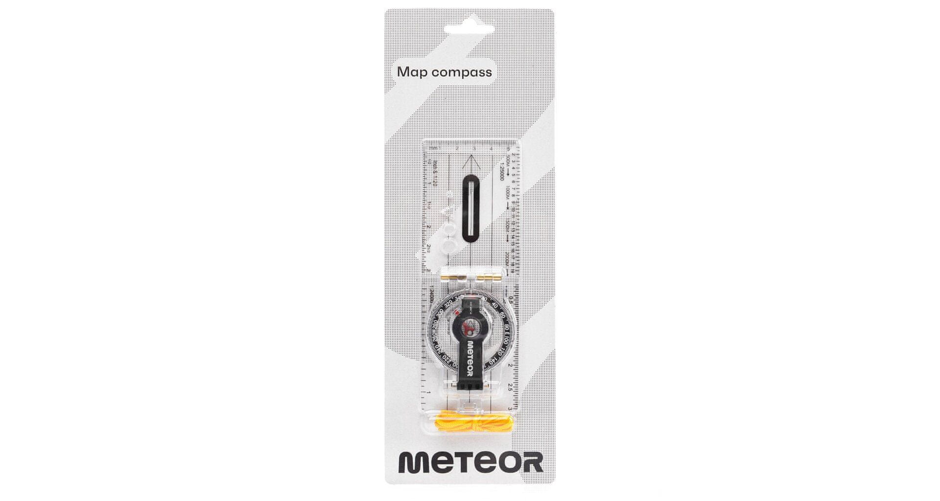 Meteor 71008 zložljivi kompas z majhnim povečevalnim steklom je namenjen določanju geografskih smeri. S tem kompasom lahko preprosto izračunate razdalje na zemljevidih v merilu vrtljiva številčnica je potopljena v sredstvo proti zmrzovanju. Celotne mere so 80 / 160 × 60 mm, premer kompasa je 50 mm, priložena pa je tudi vrvica za nošenje okoli vratu.