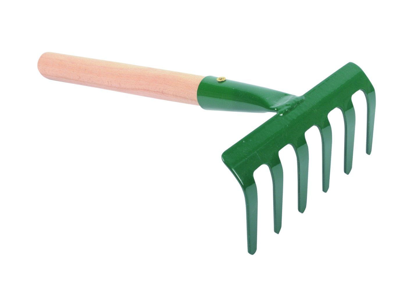 Kovinske grablje s 6 zobmi in lesenim ročajem. Primerne za urejanje cvetličnih gredic, grabljenje trave. Dolžina ročaja: 25 cm. Teža: 0,24 kg