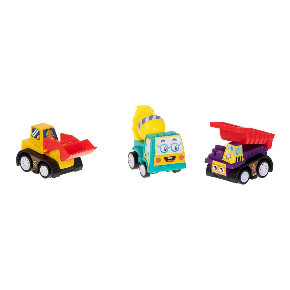 Set avtomobilčkov na pogon. Pisanih gradbenih vozil imajo premične dele, da je igra bolj zanimiva. Komplet vsebuje m.v betonskem mešalniku, valjček. Pakirano v folijskem ovoju z zapiralom. Dimenzije avtomobila: 5×4×3cm (pakiranje: 10×11×3cm) Celoten opis