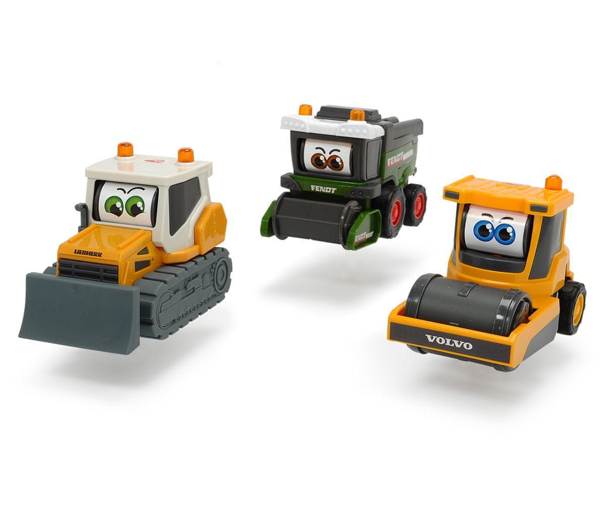 Zabaven delovni avtomobil za najmlajše, ki med vožnjo deluje v prostem teku in zavija z očmi. 3 vrste: kombajn Fendt, kompaktor Volvo ali buldožer Liebherr. Dolg 16 cm.