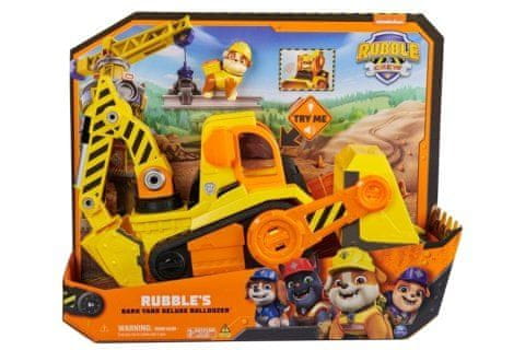 Sestavite ekipo s svojim najljubšim psom Rubblom in njegovim buldozerjem Bark Yard Deluxe! Ta čudoviti komplet ima prava delujoča kolesa, dva členkasta instrumenta ter impresivne svetlobne in zvočne učinke, zaradi katerih ga morajo imeti vsi oboževalci Rubbla in njegove druščine! Ta neverjeten komplet figure in vozila vključuje figuro Rubbla, ki meri 5 cm v višino in je oblečena v uradno uniformo Rubbla in njegove tolpe, zato je videti natanko tako kot v seriji. Ko je čas za delo, posadite Wheelerja na voznikov sedež in s pritiskom sprožite impresivne svetlobne učinke in zvoke iz serije! Z gibljivim bagrom začnite kopati, nato pa s premikajočo se zajemalko odstranite zemljo s poti, tako kot to počne Rubble! Za še več zabave iz sveta Rubbla in njegove druščine lahko z gradbenim tovornjakom, kinetičnimi figuricami iz peska Build-it ali žerjavom skupaj s kompletom Rubblova delavnica zgradite lastno gradbišče kar pri vas doma (naprodaj posebej)! Oživite serijo Rubble in njegovo ekipo z buldožerjem Rubble's Bark Yard Deluxe!