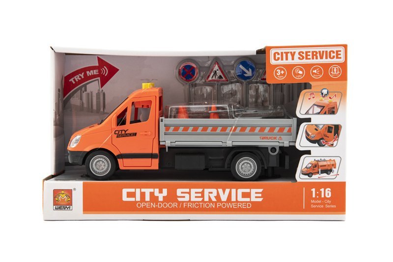 Cestni avtomobil, poln prometnih znakov in orodja, potrebnega za delo vsakega cestnega delavca. Vzdrževanje cest, pločnikov in parkov je pomembno v vsakem mestu. Avtomobil je v merilu 1:16, je na vztrajnik, s svetlobo in zvokom. Vključene so 3× baterije AG13. Dimenzije 32 × 19 × 12 cm Primerno za otroke od 3. leta starosti.