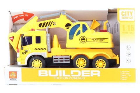 Plastični tovornjak z bagerjem na baterijski pogon. Ko pritisnete gumbe, se sprožijo zvoki in prižgejo luči. Napajanje 3× baterije AG13/LR44 – vključene. Dimenzije približno 32,5 × 19 × 12 cm. Starost 3+