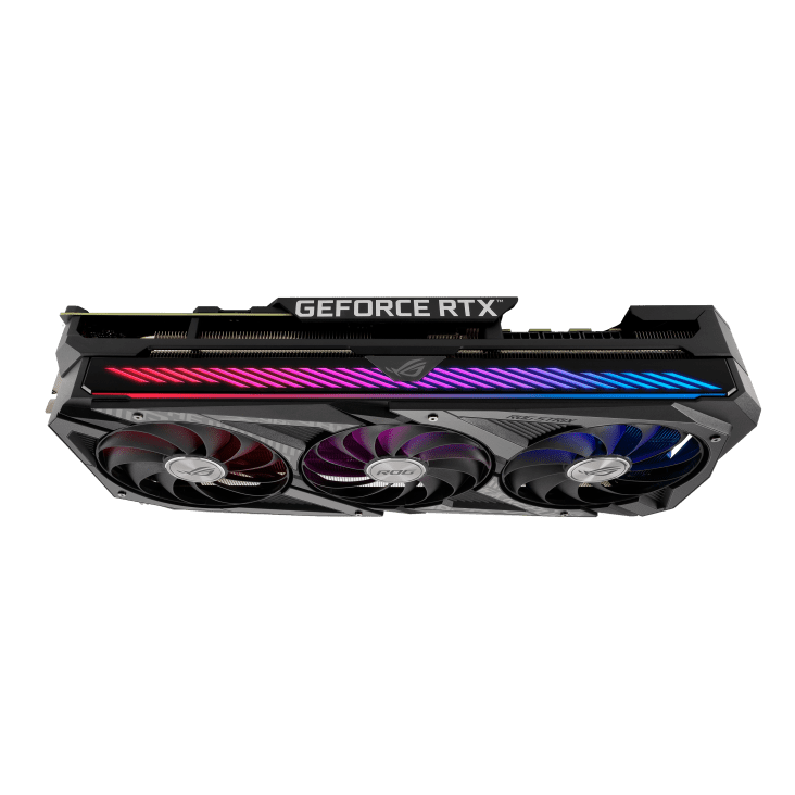 Grafična kartica ASUS ROG Strix GeForce RTX™ 3080 Ti OC vsebuje napreden hladilni sistem. Nameščeni so trije močni ventilatorji z aksialno tehnologijo in s kar 13 lopaticami na srednjem ventilatorju ter 11 na stranskih. Ventilatorji tako zagotavljajo še boljši pretok zraka skozi hladilno mrežo, izboljšave najdete tudi na zadnji strani kartice, kjer vroč zrak odteka proti izpušnim ventilatorjem, namesto da bi ga reciklirala zasnova hladilnika.