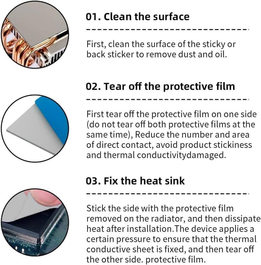 • Enostaven in praktičen za uporabo – Velikost:100 × 100 × 2,0 mm, lahko ga po potrebi razrežete. Kot nalašč za zapolnjevanje rež na kontaktni površini, so primerna zamenjava za običajno mast za hladilnike, enostavna in priročna za uporabo. Odličen pomočnik za začetnike in profesionalce.