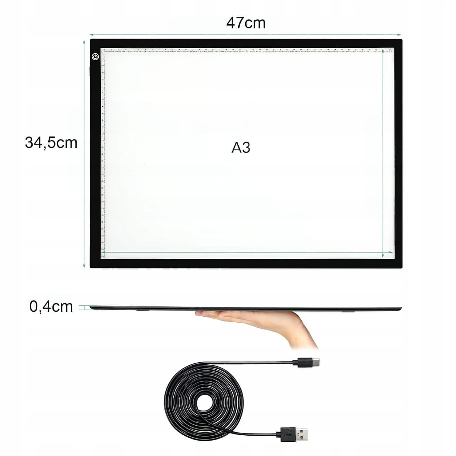 Ste naveličani utrujenih oči in nenatančnih risb pri delu z detajli? Naša velika grafična USB LED tablica formata A3 za slikanje in skiciranje je ultimativno orodje za umetnike, oblikovalce, arhitekte in vse ustvarjalce, ki iščejo natančnost in udobje pri svojem delu! Ta tanka in svetla tablica zagotavlja enakomerno osvetlitev, ki vam omogoča enostavno sledenje, skiciranje in ustvarjanje osupljivih umetniških del, tudi v slabo osvetljenih prostorih.
