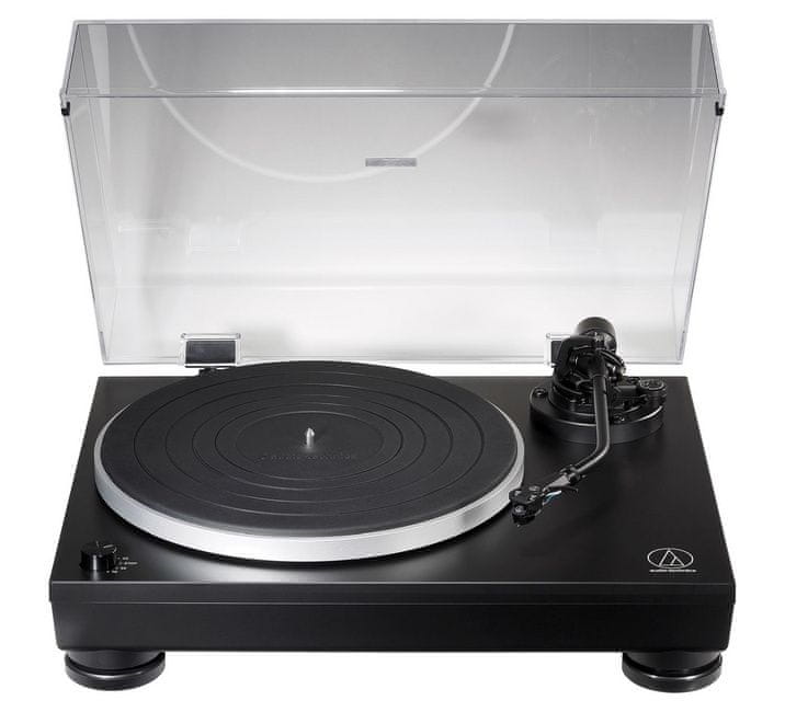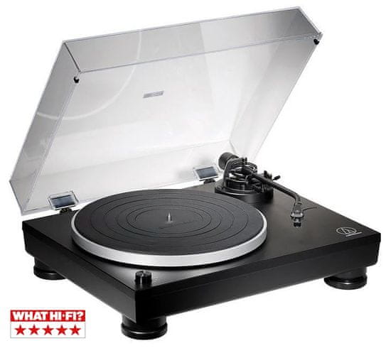 Vrhunski gramofon AT-LP5X priznanega proizvajalca Audio-Technica prinaša sodobno tehnologijo, moderen dizajn in odlične zmogljivosti. Ima vgrajen tih in stabilen DC motor, ki deluje pri treh hitrostih 33–1/3, 45 in 78 RPM, AT-VM95E črno odjemno glavo z dvojnima gibljivima magnetoma, lahek nastavek za glavo AT-HS6 ter MM/MC predojačevalnik. Ročka v obliki črke J, ki je opremljena z nastavljivo protiutežjo in nadzorom proti zdrsavanju je narejena po zgledu modelov iz 60-ih in 70-ih ter poskrbi za učinkovito zmanjšanje napak pri predvajanju. Vgrajen ima kovinski stabilizatorski (gimbal) sistem in natančne ležaje, kar zmanjšuje napake pri vrtenju.