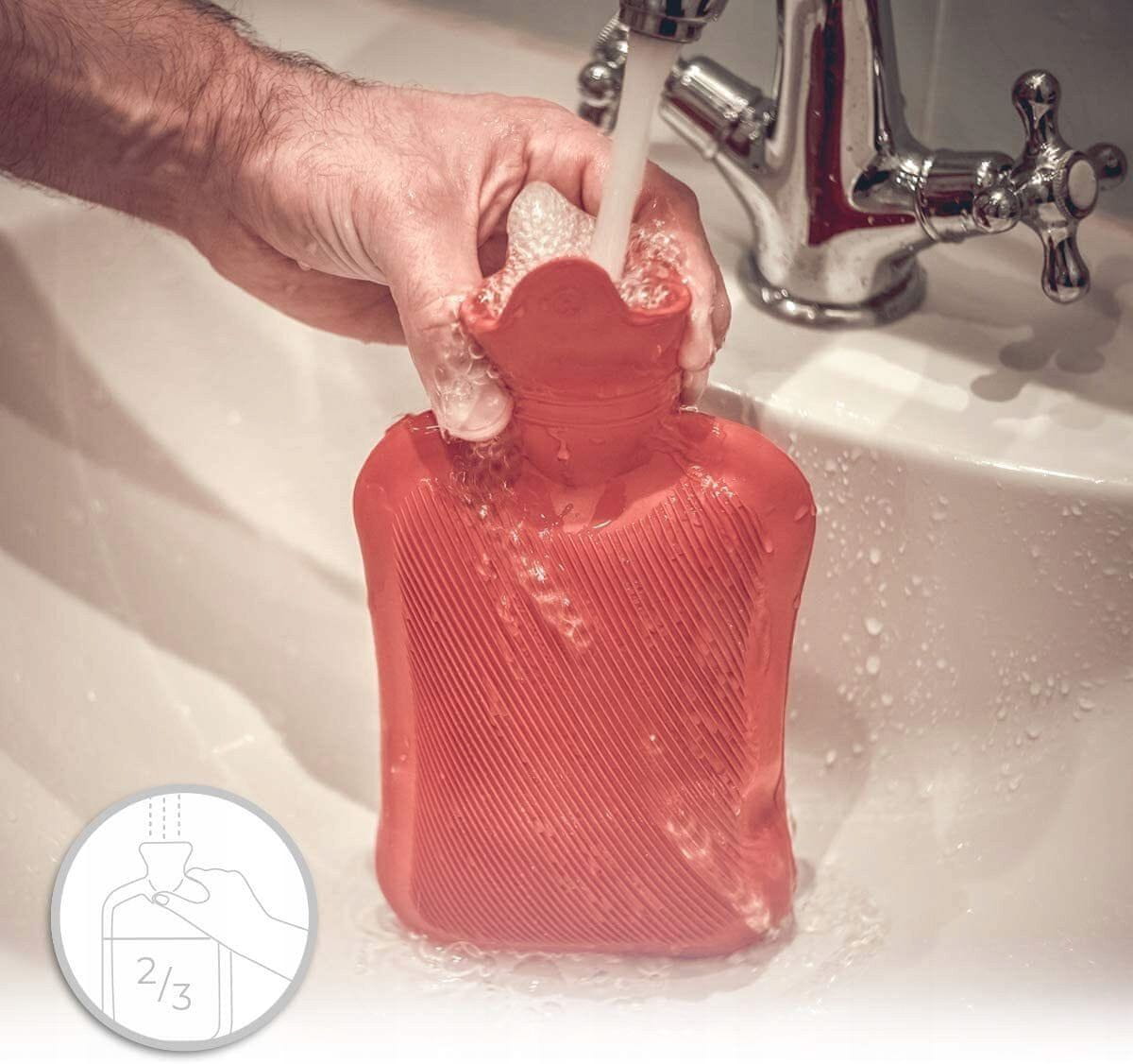 3. Po polnjenju z vodo obvezno preverite tesnilo. Postopoma pritiskajte na termofor, dokler se iz njega ne začne izlivati voda, nato pa zategnite pokrovček.