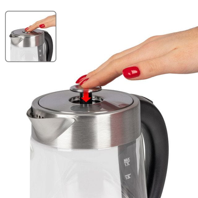 1,7-litrskivrč za vodo je povezan z osnovno postajo prek 360-stopinjskega priključka. Pokrov je zaradi varnosti mogoče zakleniti. Grelni element je izdelan iz nerjavnega jekla in je skrit. Priložen je odstranljiv apnenčasti filter. Izklop je mogoč ročno ali samodejno. Nivo vode je viden skozi toplotno odporno steklo, natančnejšo vrednost pa je mogoče določiti s funkcijami. Seveda je na voljo zaščita pred pregrevanjem.