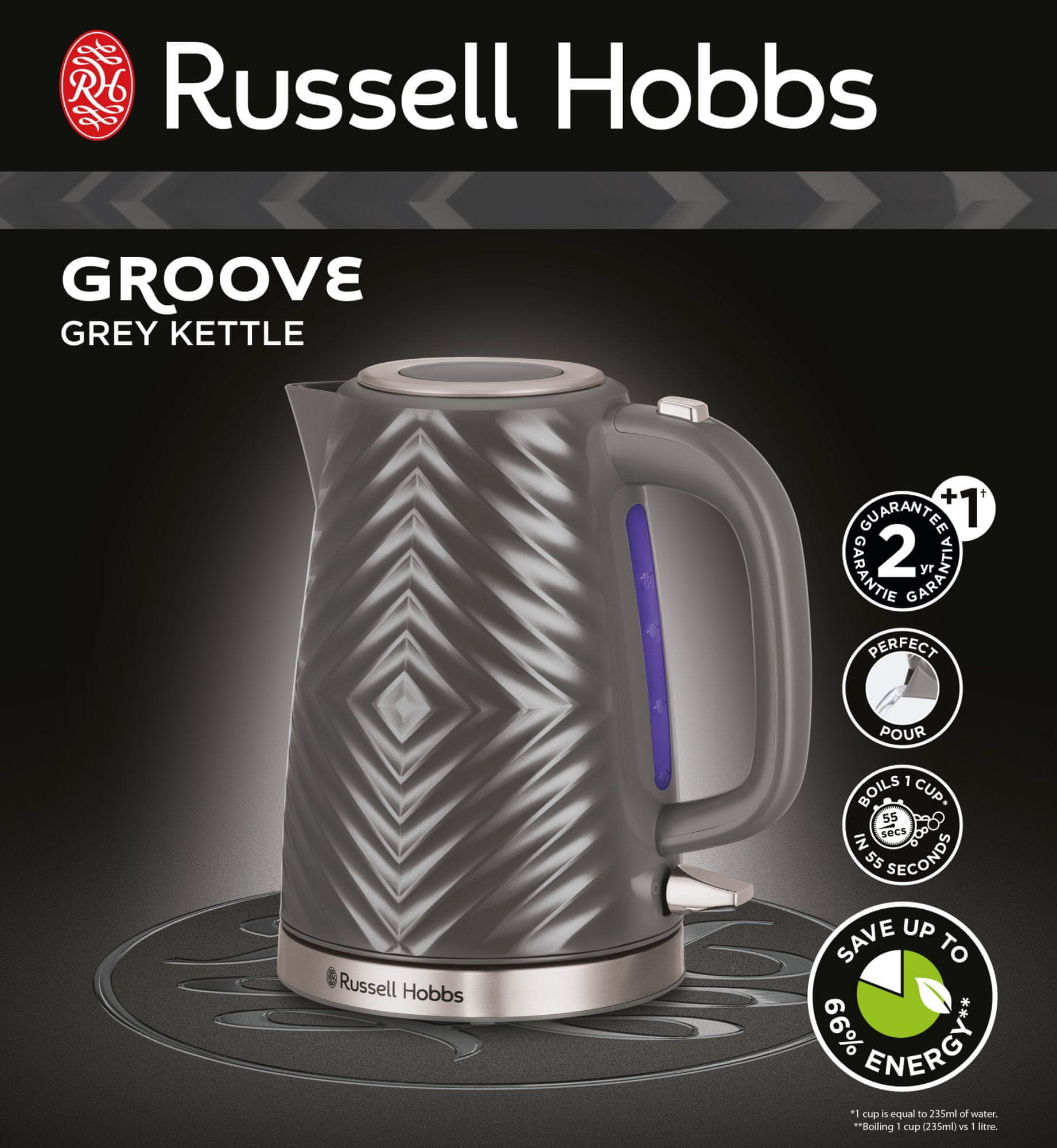 Grelnik vode s teksturiranim dizajnom z elementi iz brušenega nerjavečega jekla. Russell-Hobbs Groove ima prostornino 1,7 litra, indikator nivoja vode, modro notranjo osvetlitev in pokrov, ki ga lahko odprete s pritiskom. Funkcija hitrega kuhanja z indikatorji števila skodelic. Celoten opis