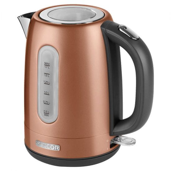 Električni kuhalnik Sencor SWK 1776GD s prostornino 1,7 l iz visokokakovostnega nerjavečega jekla v zlati barvi. Odstranljivi filter zadržuje umazanijo in usedline. Samodejni izklop pri vrelišču in zaščita pred pregrevanjem ob vklopu brez vode odpravljata nevarnost požara. Moč 2150 W. Celoten opis