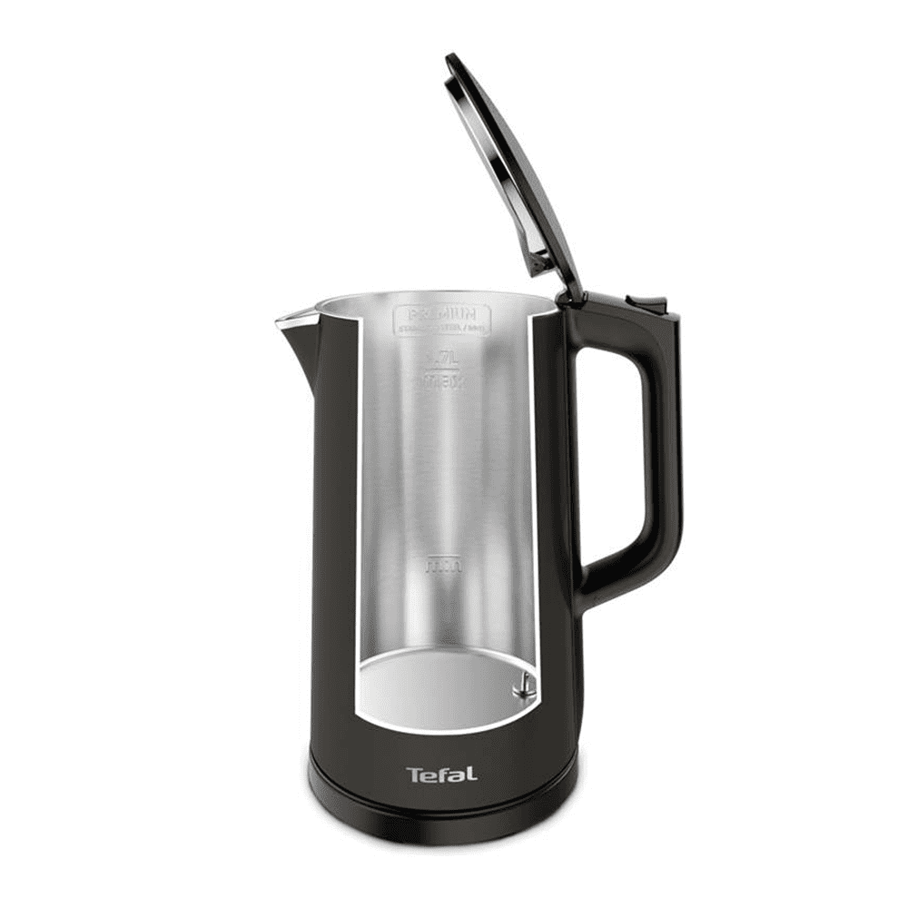 Električni grelnik vode Tefal v črni izvedbi. Način na dotik, 5 nastavitev temperature, dvojna stena, prostornina 1,7 l, moč 1800 W, odstranljiv filter. Celoten opis