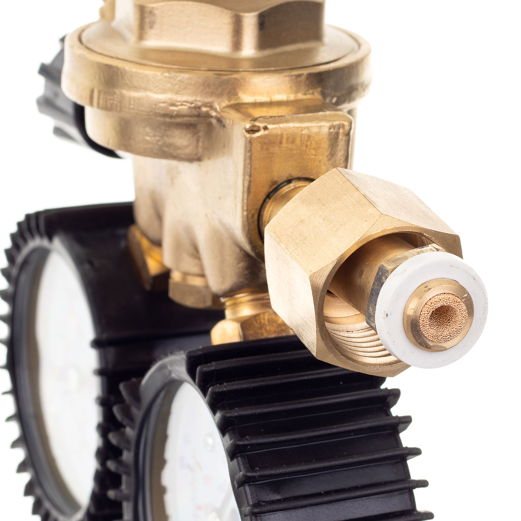 Regulator je opremljen s prozornimi manometri, veliko, masivno konstrukcijo, ki učinkovito odvaja nizko temperaturo, ki nastane med raztezanjem plina.