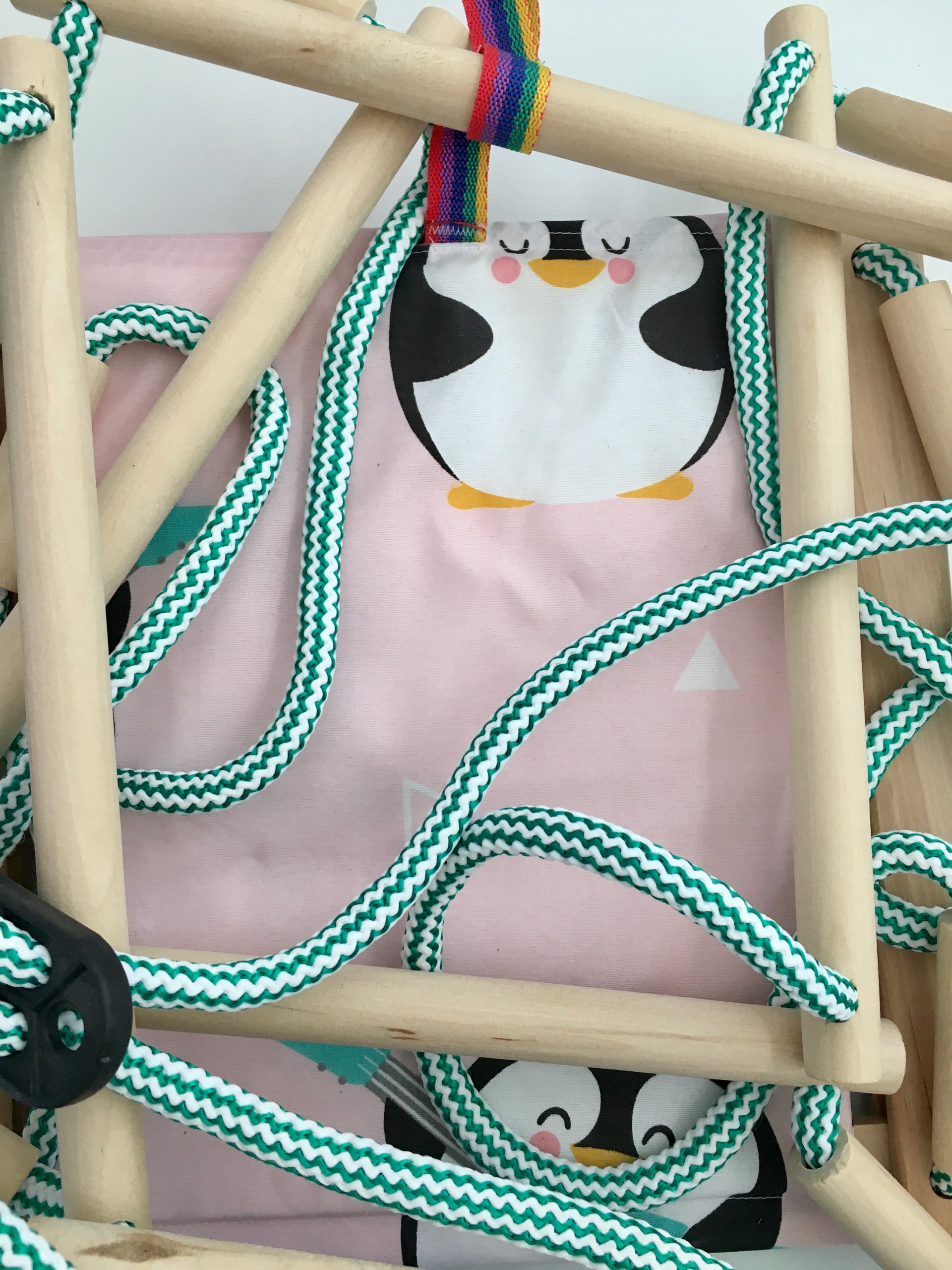 Barvita lesena viseča gugalnica z roza blazino z vzorcem pingvina.