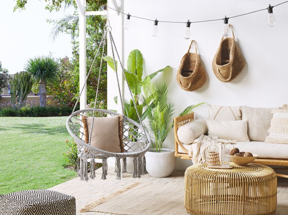 S tem visečim stolom se boste v trenutku resnično sprostili. V spalnici, dnevni sobi ali na balkonu se udobno namestite in uživajte v nežnem zibanju. Dizajnerski fotelj macramé ima trpežen okvir s pletenim sedežem iz bombažne tkanine v slogu boho in bo v vsakem prostoru ustvaril brezskrbno vzdušje. Obesite ga na izbrano mesto in ustvarite čudovit kotiček za druženje.
