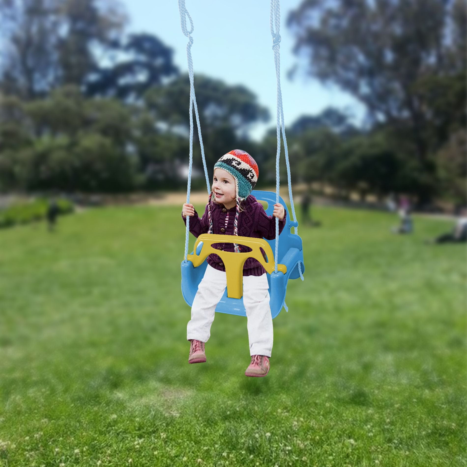 Ta lepa otroška gugalnica z varnostno ograjo je izdelana iz kakovostnega materiala, ki je odporen proti vremenskim vplivom.