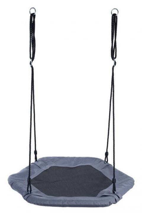 Šestkotna gugalnica Štorkljino gnezdo v sivi barvi je idealna za notranjo in zunanjo uporabo, vaši otroci pa jo bodo vzljubili. Sedež gugalnice je izdelan iz visokokakovostnega poliestra, ki je odporen na vremenske vplive in obrabo. Pocinkani okvir je zaščiten s penasto oblogo, da bo vaš otrok med guganjem varen in udoben. Premer sedeža štorkljinega gnezda je 92 cm, njegova največja nosilnost pa je 100 kg . Višina dveh vrvi za obešanje je nastavljiva do 160 cm. Debelina visečih vrvi je 1 cm. Gugalnica je obešena s kovinskimi obroči, ki so napeljani skozi viseče vrvi. Primerno za otroke od 3. leta starosti dalje.