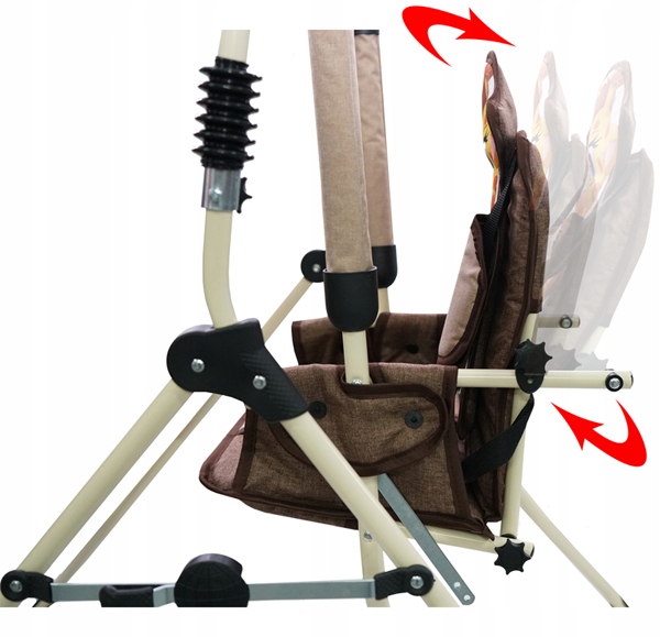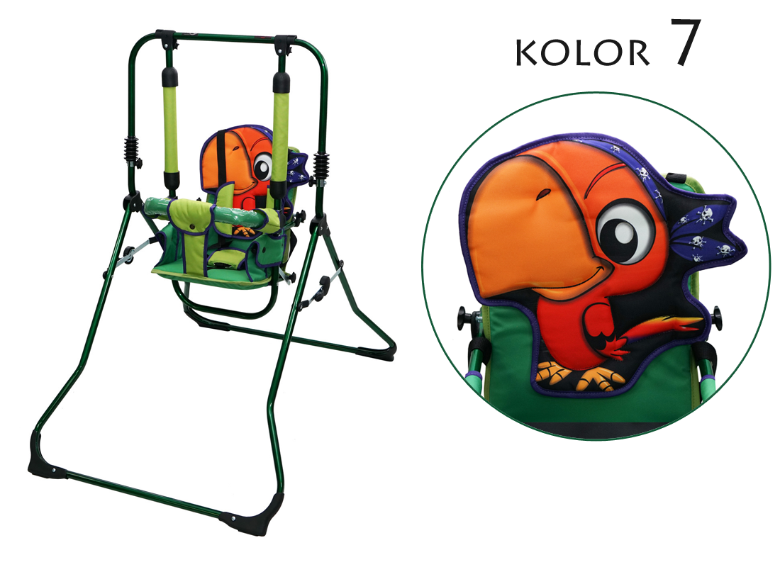 oblikovano naslonjalo , prevlečeno z mehkim materialom, z možnostjo nastavitve kota nagiba. Celotna konstrukcija je opremljena z nedrsečimi nogami, ki zagotavljajo njeno stabilnost. Dražba je za gugalnico v barvi št. 7 Tukan