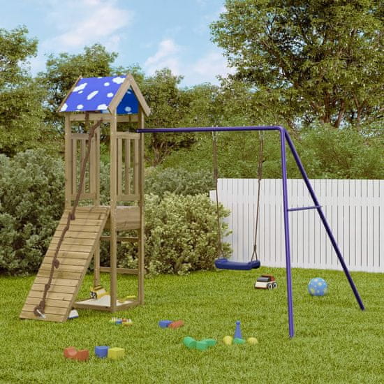 Želite svojim otrokom omogočiti svobodno igro doma? To leseno zunanje igralo spremeni vaše dvorišče v igrišče za domišljijske dogodivščine! Vzdržljiv material: To vrtno igralo je izdelano iz tlačno impregnirane borovine. Trden borov les je znan po svoji trdnosti in trajnosti. Ravni vzorci in značilni vozli prispevajo k rustikalnemu čaru. Impregniran je bil z raztopino konzervansa in obdelan v avtoklavu. kar poveča njegovo odpornost proti gnitju in vremenskim vplivom.Stabilen lesen okvir: Lesen okvir vrtnega lonca zagotavlja trdnost in stabilnost. Poleg tega noge otroške gugalnice v obliki črke A zagotavljajo ravnotežje.Večnamenski center: Plezalni okvir ima 90 cm visoko ploščad. odlikujejo pa ga plezalna stena. enojna gugalnica in peskovnik. Vaši malčki lahko k zabavi povabijo tudi svoje prijatelje.Premišljena zasnova: Obdajajoče lesene ograje so zasnovane tako. da zagotavljajo varnost otrok med njihovo veselo igro. Poleg tega streha zagotavlja senco za vaše otroke v vročih poletnih dneh.Neskončna zabava: To zabavno leseno igralo je odličen način. da vaši otroci s svojimi prijatelji uživajo v zabavi. imajo več interaktivnega časa in ustvarjajo nepozabne spomine! Opozorilo:Samo za domačo uporaboZunanja uporabaNi primerno za otroke. mlajše od 3 letPriporočena starost uporabnika: 3–8 letNajvečja teža na uporabnika: 45 kg Dobro je vedeti:Izdelek mora biti zasidran. da se zmanjša nevarnost prevrnitve. Sidra niso vključena.Celotne dimenzije: 238 × 196 × 208 cm (D x Š x V)Potrebno sestavljanje: DaIgralni stolp:Material igralnega stolpa: Podtlačno impregnirana borovinaMaterial strehe: PoliesterDimenzije: 52.5 × 46.5 × 208 cm (D x Š x V)Višina platforme: 90 cmPlezalna stena z vrvjo:Material: Podtlačno impregnirana borovinaDimenzije: 45 × 5 × 108 cm (Š x G x V)Gugalnica:Barva: ModraMaterial: PP (polipropilen). kovinaCelotne dimenzije: 184 × 159.5 × 162 cm (Š x G x V)Dimenzije gugalnice: 32.5 × 22 × 104.5 cm (Š x G x V)Lastnosti:1 x Igralni stolp1 x Plezalna stena z vrvjo1 x Gugalnica