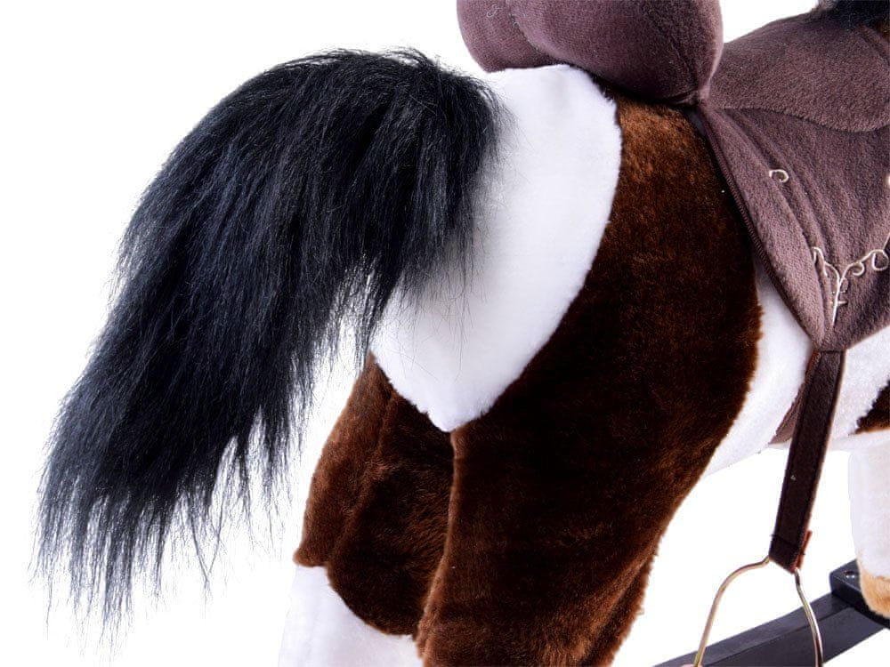 Konj je narejen iz mehkega pliša. Ima lesene ročaje, vajeti in oblikovan sedlo s stremeni.