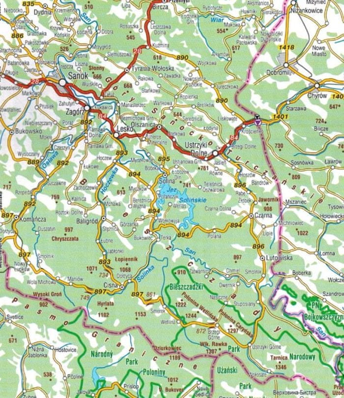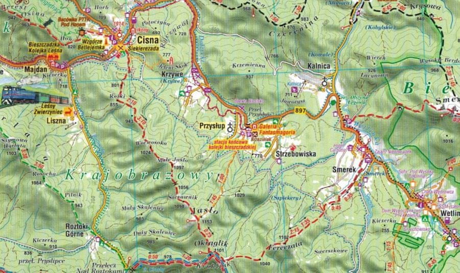 Zložljiv zemljevid turističnih znamenitosti Bieščadskega gorovja v merilu 1 : 100.000, ki ga je izdala založba Compass.