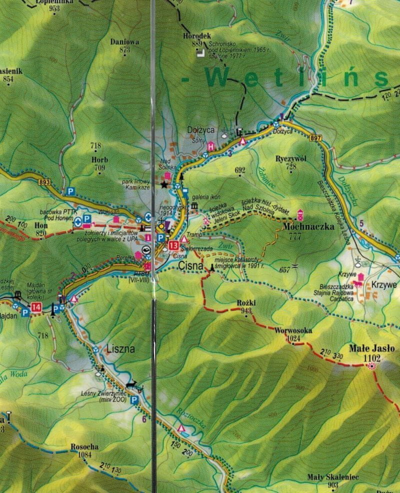 Na hrbtni strani zemljevida so panoramske fotografije najlepših pokrajin Bieszczady skupaj z opisi vrhov. Točke, s katerih so bile fotografije posnete, so označene na zemljevidu. Fotografije spremljajo opisi najprivlačnejših krajev v regiji ter turistični in avtomobilski zemljevid območja Bieszczady.