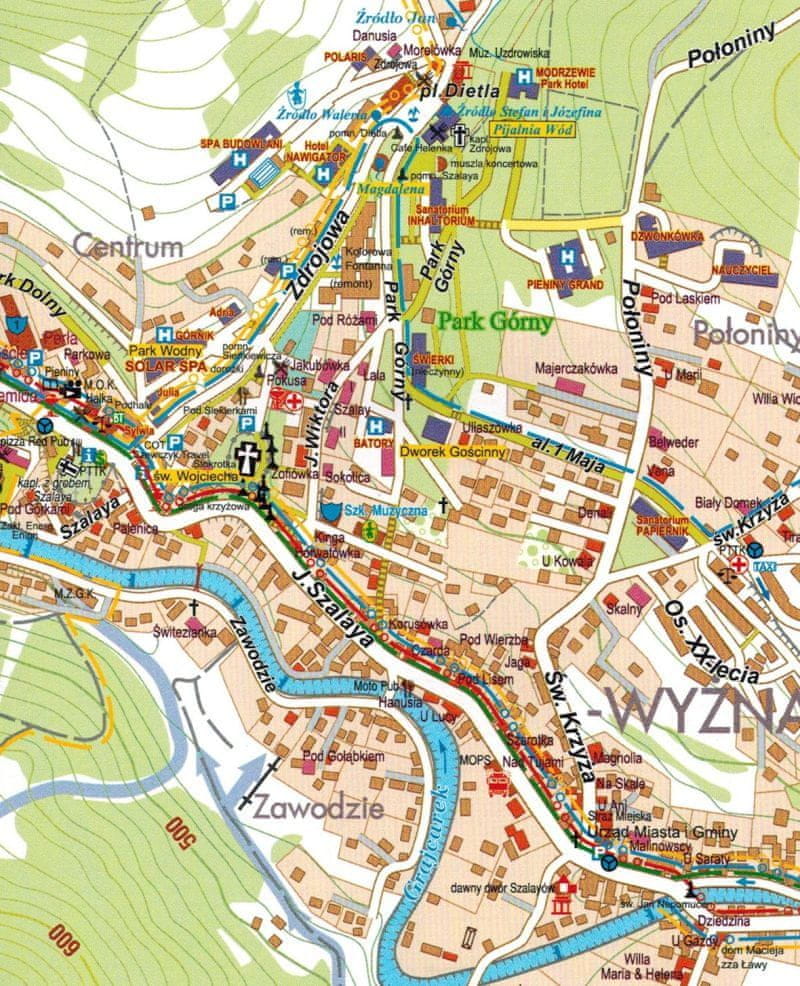 Na hrbtni strani so predstavljeni predlogi poti z višinskimi profili in opisom turističnih znamenitosti. Poleg tega so na voljo načrti Krościenka nad Dunajcem in Szczawnice v merilu 1 : 9.500.