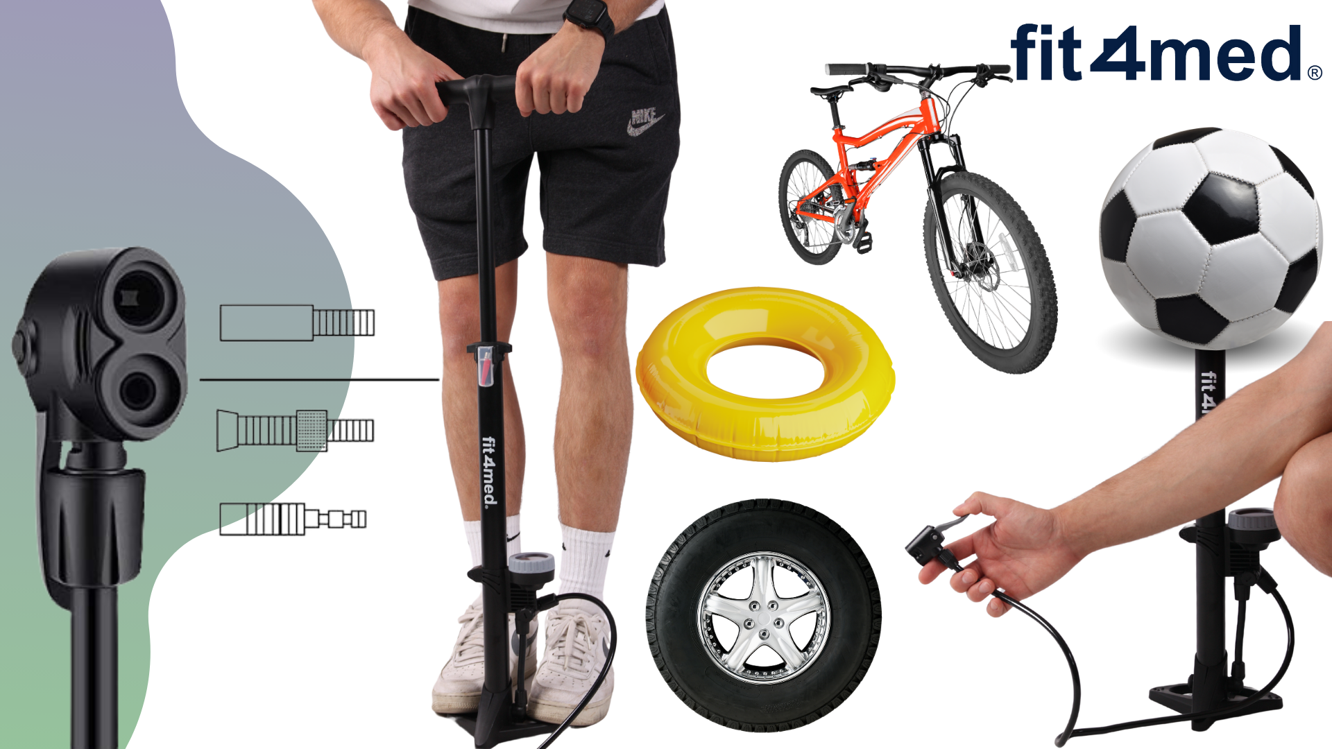 • Praktična posoda z 2 adapterjema – 2 dodatna adapterja za žoge in vzmetnice – nameščena v posodi, nameščeni na ročaju črpalke