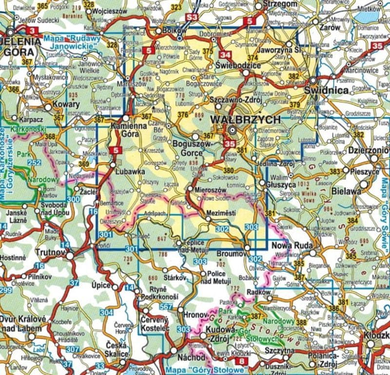 Obseg zemljevida označujejo: Kamienna Góra na zahodu, Bolków na severu, Świdnica in Głuszyca na vzhodu ter češko mesto Broumov na jugu. Zahvaljujoč temu zemljevid vključuje tudi med turisti izjemno priljubljeno Adrspaško-Teplické skale (Skalno mesto).