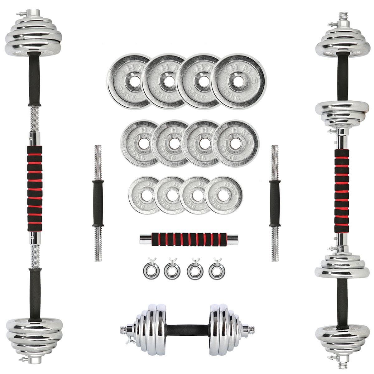 Značka HMS sa zameriava predovšetkým na materiály najvyššej kvality. HMS STC21 je vyrobená z chrómovanej ocele s certifikátom veľmi vysokej pevnosti. To zaručuje roky bezproblémového používania. Na rukovätiach činiek je guma, ktorá zaisťuje pevný a pohodlný úchop. Dodávaný konektor na vytvorenie činky je pokrytý špongiou, čo je veľmi užitočné napríklad pri drepoch. Vďaka tomu nevzniká žiadne nepohodlie spôsobené tlakom činky na chrbát.