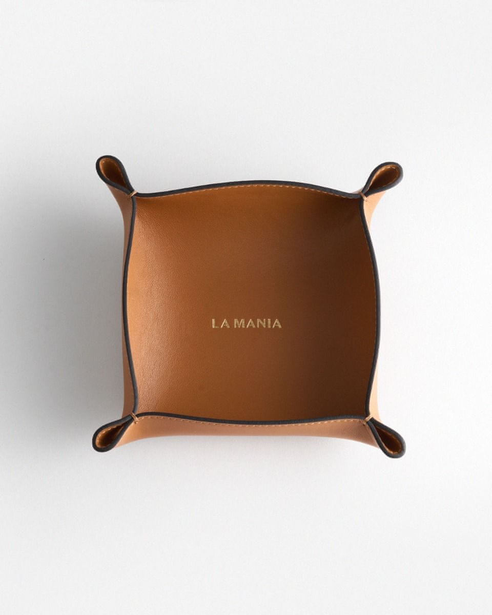 Izdelan iz pravega italijanskega usnja v barvi konjaka, okrašen z zlato vtisnjenim logotipom La Mania in svetlo rjavimi šivi.