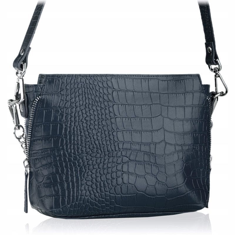 Ženska usnjena torbica čez ramo Betlewski® je odlična izbira, ker: kupujete poljski izdelek in podpirate poljsko podjetje. Izdelana je iz pravega, polnozrnatega usnja z aligatorjevo teksturo. Ima neverjetno modno in elegantno temno modro barvo. Priložen je snemljiv naramni in ročni trak – torbo nosite, kakor koli želite. Modna in elegantna torbica s čudovito teksturo in elegantno temno modro barvo. Ta torbica vas bo naredila za kraljico vsake zabave! Izdelana je iz pravega polnozrnatega usnja, vtisnjenega z neverjetno modno aligatorjevo teksturo. Ima snemljiv trak, tako da jo lahko nosite, kakor koli želite – na rami ali v roki. Srebrna verižica, ki jo krasi, poudarja neverjetno moden videz torbe – s tem dodatkom boste zagotovo pritegnili poglede. Na prvi pogled indeks: TWB-KRO-10-GRAN material: pravo usnje barva: temno modra znamka: Betlewski širina: 21 cm višina: 17 cm globina: 7 cm dolžina traku: 120 cm Dizajnerska torbica, ki očara s svojimi detajli. Na sprednji strani torbe je vtisnjen srebrn logotip blagovne znamke Betlewski®. Popolnoma dopolnjuje eleganten temno moder odtenek usnja in odlično poudarja modno teksturo usnja. Logotip je trdno pritrjen na usnje, zato ste lahko prepričani, da bo torba dolgo zdržala. Pravo usnje z najmodnejšo teksturo. Torbica je izdelana iz mehkega, dišečega, polnozrnatega govejega usnja z aligatorjevo teksturo. Je prijetno in gladko na dotik. Ima neverjetno eleganten temno moder odtenek, ki nikoli ne gre iz mode! 100 % pristno. Torbica je opremljena z etiketami, ki potrjujejo pristnost izdelka, informacijami o negi usnja in vzorcem usnja, uporabljenega pri njeni izdelavi. S temi torbami vam je zagotovljeno pristen izdelek, ki vas bo dolgo časa navduševal. Vsebina je zaščitena z močno zadrgo. Torba se na vrhu zapira z zadrgo. To zagotavlja, da je njena vsebina dobro zaščitena – lahko ste prepričani, da bodo vaše stvari varne v notranjosti. Okrasne zadrge – privlačen detajl. Dve okrasni srebrni zadrgi se nahajata na straneh torbe. Čudovito poudarijo teksturo in barvo usnja ter vaši obleki dodajo rahlo drzen pridih. Udobje, ki ga boste cenili – snemljiv naramni trak. Torba je opremljena z dolgim [največ 120 cm] usnjenim naramnim trakom. Nastavljiv je na pet dolžin. Trak ima za to nastavitev zaponko. Trak je pritrjen s srebrnimi vponkami, zato ga lahko preprosto snamete, če se odločite, da bi torbo raje nosili brez njega. Srebrna verižica za elegantne ženske. Komplet vključuje tudi snemljivo srebrno verižico. Zaradi kratke dolžine 38 cm bo odlično služila kot ročaj za nošenje torbe v roki. Udobje in stil – prostoren notranji žep. V notranjosti je en majhen žep z zadrgo. Idealen je za shranjevanje šminke, bronzerja ali telefona. Notranjost je podložena z elegantno satenasto podlogo, ki poudarja edinstven značaj torbe. Na podlogo je všita usnjena etiketa z logotipom blagovne znamke – naš zaščitni znak, ki pomeni, da se nismo osredotočili le na funkcionalnost torbe, temveč tudi na njeno lepoto. Majhna, a dobro oblikovana! Kljub majhnosti je torba zelo prostorna in lahko vanjo spravite veliko predmetov, kot sta telefon ali zvezek. Vsak dan lahko s seboj nosite vse majhne stvari, brez katerih ne zapustite doma. Pospravite jih vanjo in jih imejte vedno pri sebi! Avtentičnost in kakovost – vemo, da je to pomembno. Kakovost usnja, iz katerega je izdelana torba, potrjuje priloženi certifikat o avtentičnosti. Natisnjen je na elegantnem papirju in vam daje zagotovilo, da kupujete originalen izdelek.
