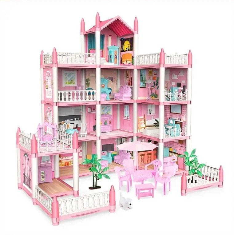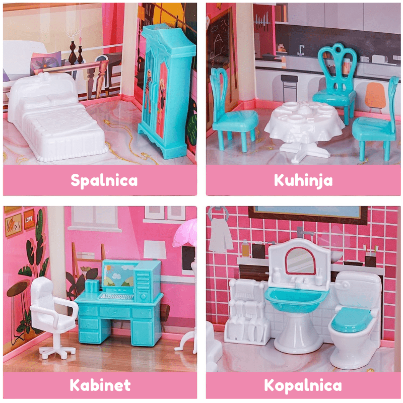 BESTMART Hiša za punčke | Igralni dvorec | 11 sob, 4 punčke | Barvna LED osvetlitev
