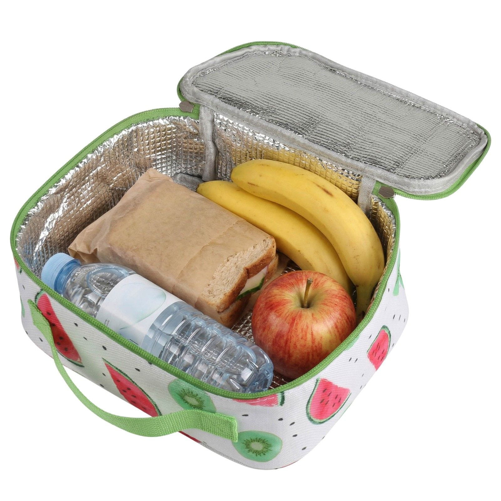 Torba pritegne pozornost s svežim poletnim vzorcem lubenice in kivija, ki ga dopolnjujeta kontrastni zeleni ročaj in zapiranje z zadrgo.