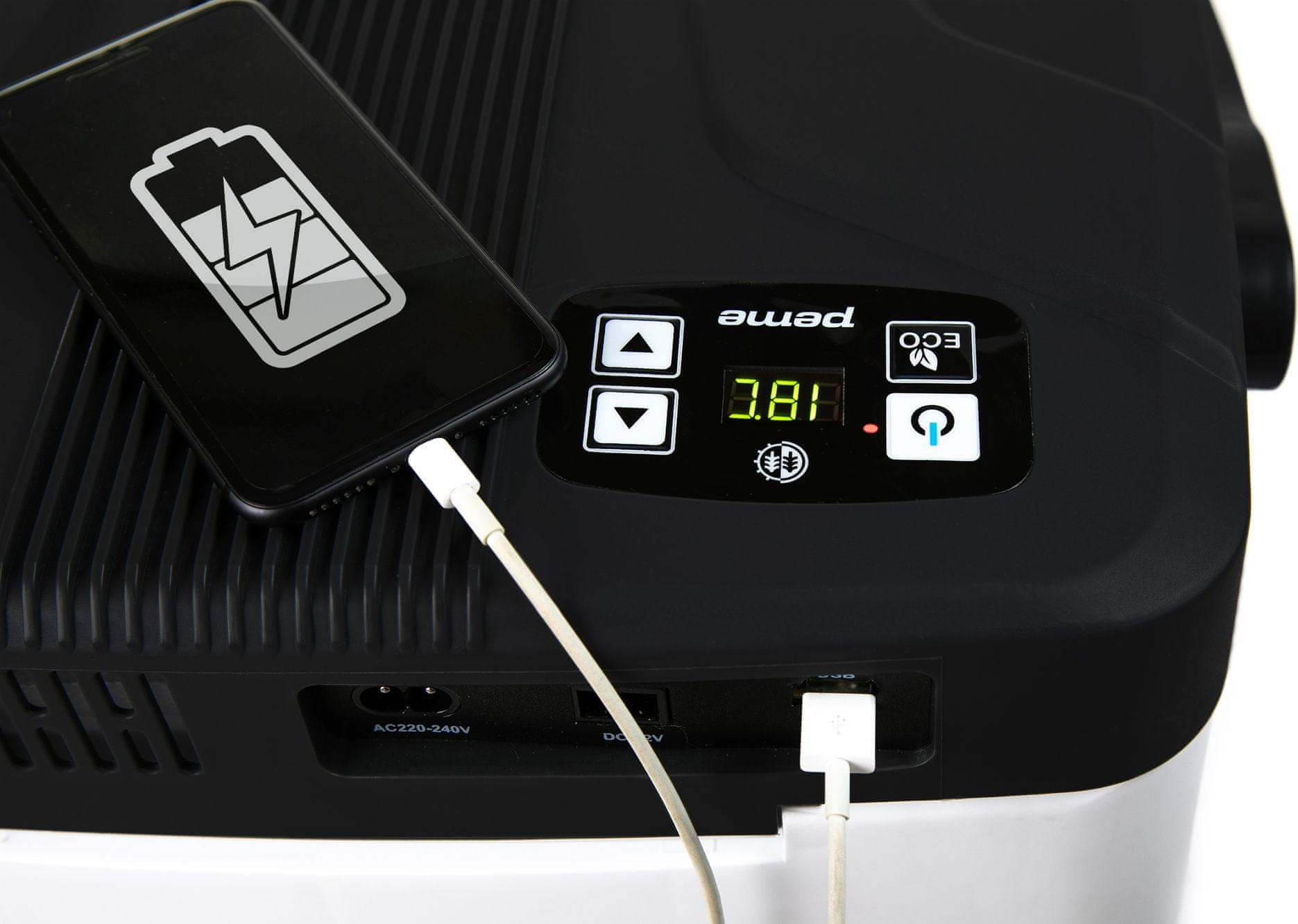 Peme Essential je zasnovan za maksimalno priročnost na poti. Vgrajena sta dva napajalna vhoda, kar omogoča napajanje iz električnega omrežja (220–240V) ali iz avtomobilske vtičnice (12V). Intuitivna nadzorna plošča omogoča enostavno nastavitev in prikaz trenutne temperature. Dodatno funkcionalnost zagotavlja način Eco za manjšo porabo energije in USB-priključek za polnjenje telefona.