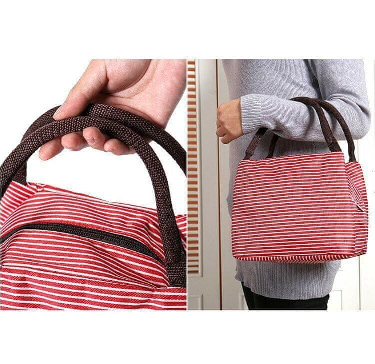 Želite s seboj na potovanje vzeti prigrizek? Pozabite na plastične vrečke. S to elegantno termo vrečko Merco bo prenašanje prigrizkov veliko lažje. Vrečka je odličen pripomoček za pohodništvo, kampiranje, piknike ali na vodi. Prav tako je priročna za prenašanje malice v službo ali šolokolesa. Termovka meri 21 × 15,5 × 17 cm in je narejena iz tkanine Oxford s privlačnim črtastim vzorcem, ki je na voljo v treh barvah (rdeče-bela, rjavo-bela, črno-bela). Zaradi notranje plasti ALU folije hrana in pijača dlje časa ohranita svojo temperaturo. Torba se zapenja z zadrgo in ima dva trpežna ročaja za lažje prenašanje. Termo vrečko lahko po uporabi enostavno zložite, tako da ne zavzame preveč prostora. Za odstranjevanje morebitne umazanije od hrane lahko termosko obrišete z vlažno krpo. Vrečke ne perite v pralnem strojuce. Pred potovanjem ti ne preostane drugega, kot da v termo torbo vstaviš škatlo s kosilom ali prigrizkom, dodaš sadje in pločevinko s pijačo ter greš.