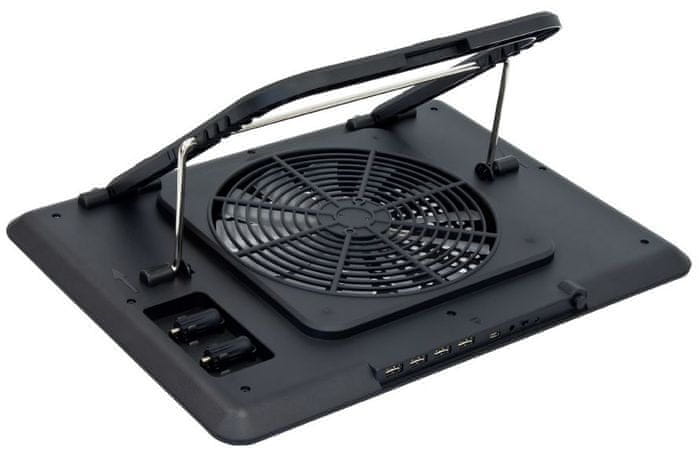 Hladilnik za prenosnik Chieftec CPD-1219TH bo učinkovito poskrbel za ustrezno hlajenje vašega prenosnika. Primeren je za prenosnike velikosti od 12" do 19". Hladilnik je izdelan iz kombinacije aluminija in kakovostne plastike. Priklopi se preko vmesnika USB 2.0, na voljo pa so vam še dodatni 4× USB 2.0 priključki.