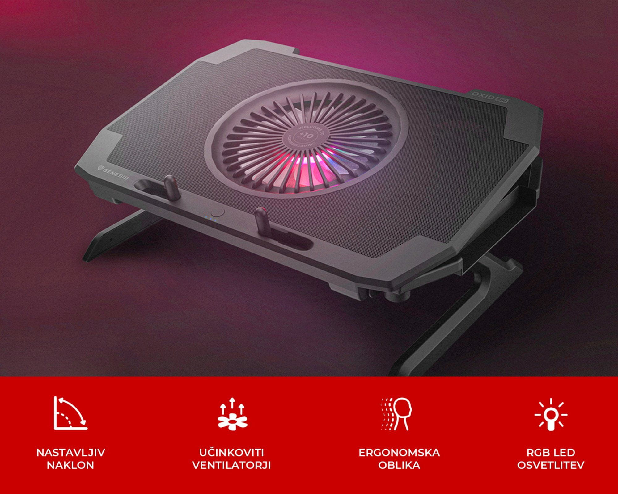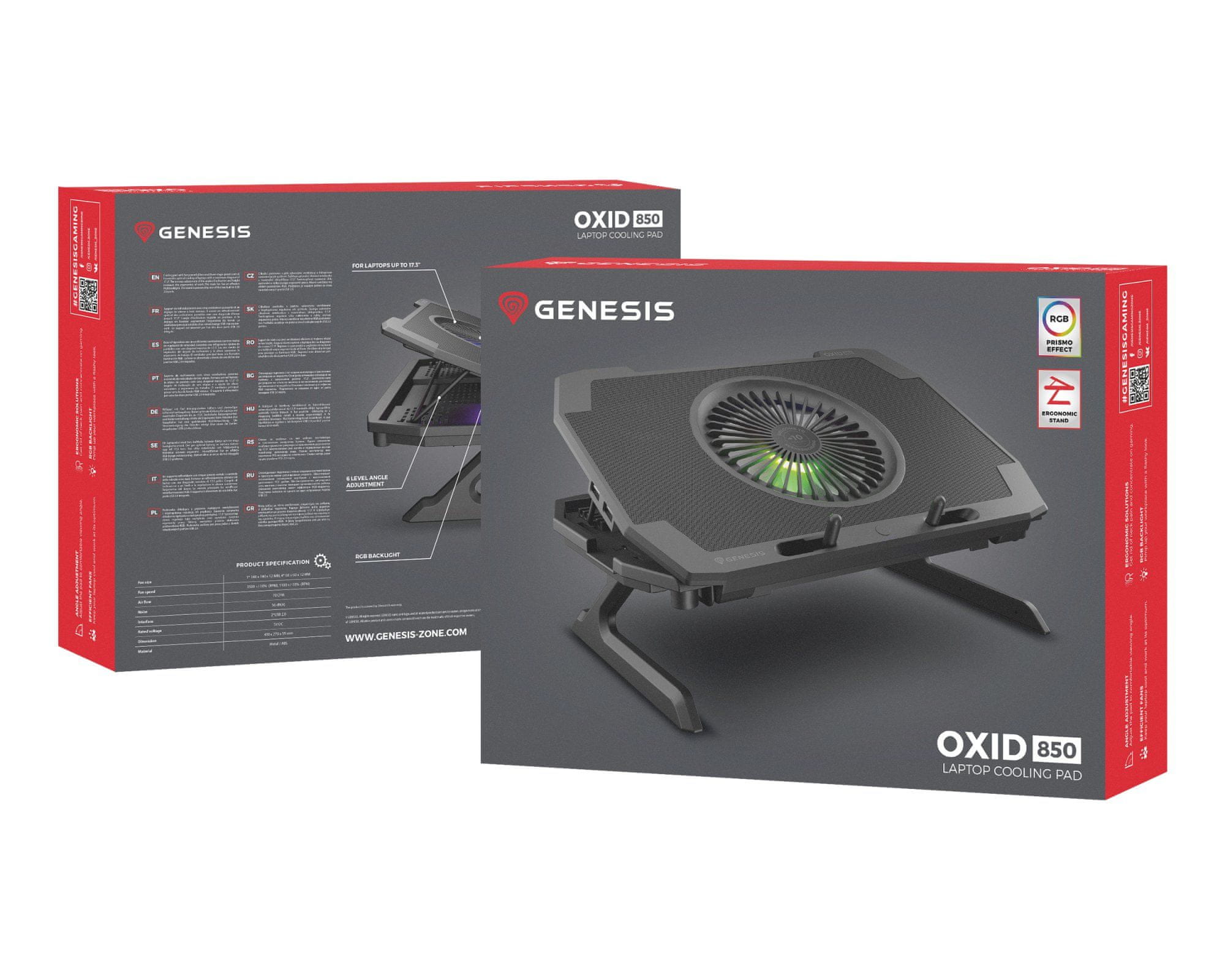 Genesis OXID 850 RGB je hladilno stojalo, namenjeno za prenosnike do velikosti 43,94 cm (17,3") in pomaga vzdrževati pravo temperaturo naprave med intenzivnim igranjem ali delom. Odlikuje ga izjemno kakovostna izdelava v kombinaciji z odličnimi lastnostmi in funkcijami: