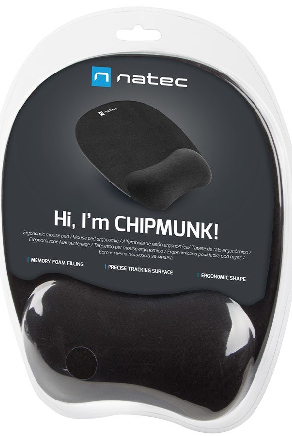 Natec Chipmunk – podloga za miško s spominsko peno, zasnovana z mislijo na ergonomijo. Njena oblika omogoča zdrav položaj rok, kar zmanjšuje tveganje za bolečine v zapestju in utrujenost med dolgotrajno uporabo računalnika.