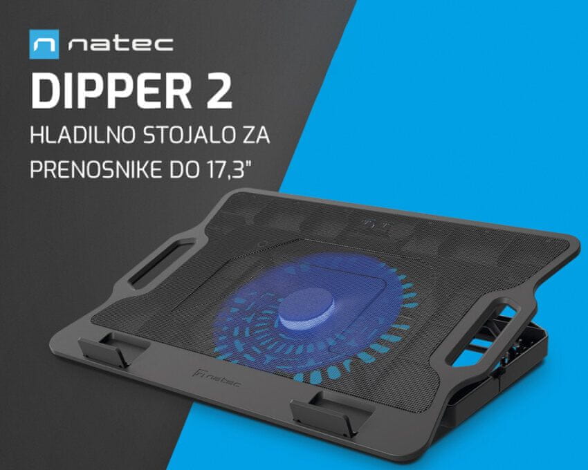 Soočite se z visokimi temperaturami s pomočjo Natec Dipper 2 hladilnega stojala, zasnovanega za prenosnike z diagonalo do 43.9 cm (17,3“). Kovinska plošča z optimalno velikostjo lukenj, 6-stopenjskim nastavljanjem kota nagiba in 180 mm ventilatorjem, katerega hitrost lahko enostavno prilagajate – in to še ni vse, s čimer vas bo stojalo presenetilo!