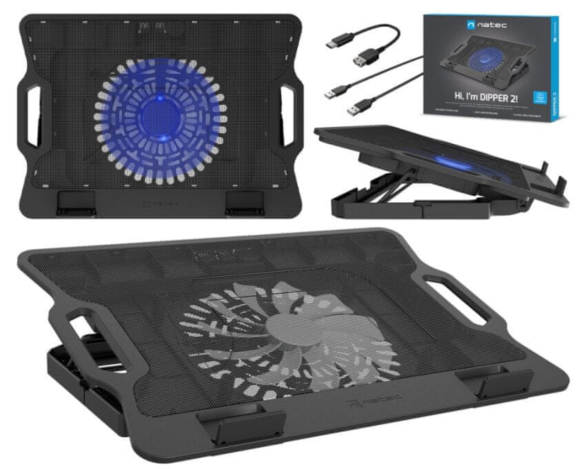 Natec Dipper 2 hladilno stojalo za prenosnike, do 17.3, 6 naklonov, 180mm ventilator, LED, 2xUSB-A