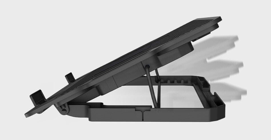 | Lastnosti | Za prenosnike do 43.9 cm (17,3“), 6-stopenjska nastavitev kota naklona, nastavljiva hitrost ventilatorja, modra osvetlitev ventilatorja, vgrajen USB hub, moderna oblika, priložen USB Type-A kabel za napajanje, priložen USB Type-C adapter za napajanje |