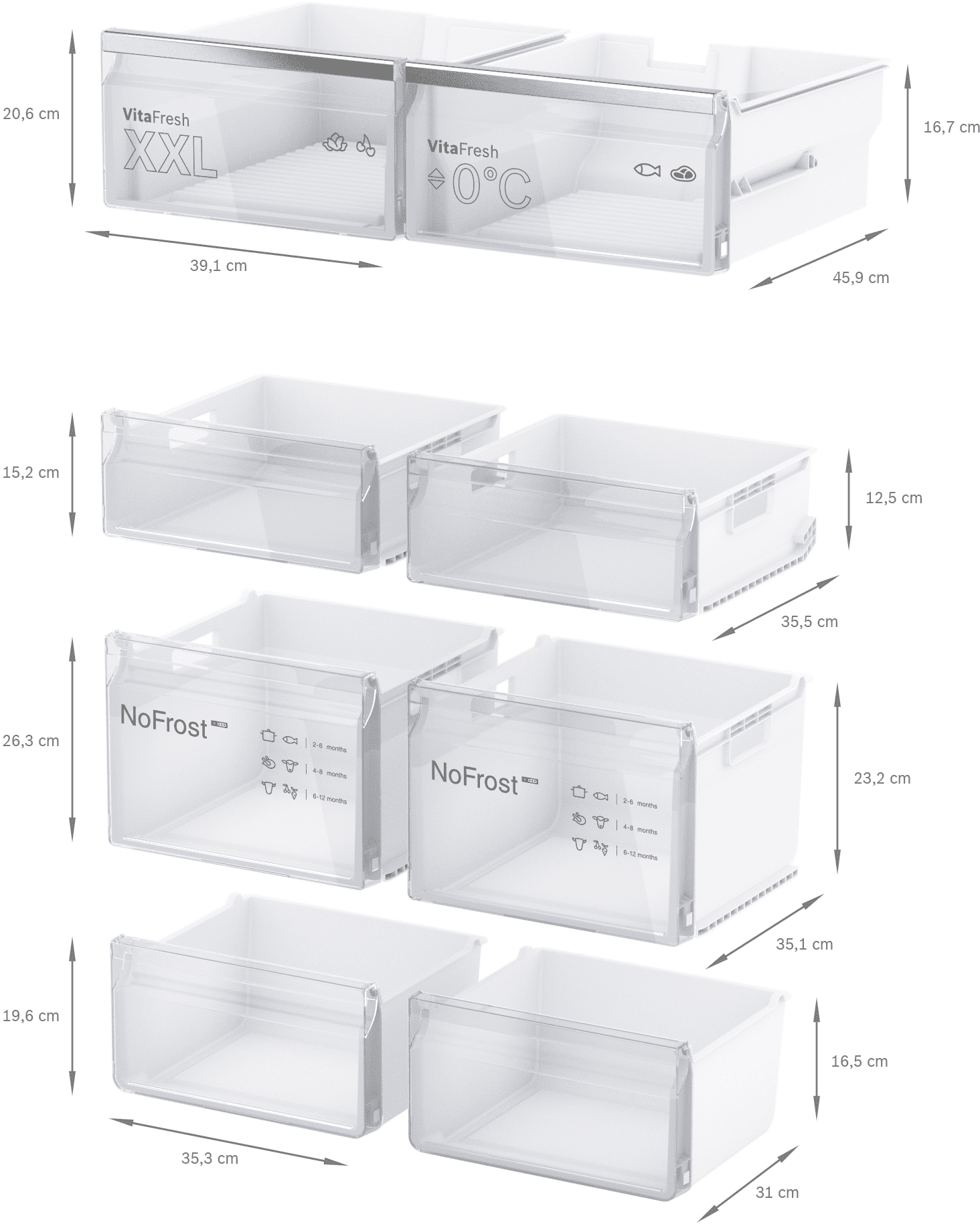 Majhna razlika v centimetrih, a velika razlika v prostornini: že majhna količina dodatnih centimetrov v širini v primerjavi s standardnim modelom vam dovoljuje, da v naše samostoječe kombinirane hladilnike z zamrzovalnikom spravite cele pekače, pa tudi velike lubenice in druge velike izdelke. Večja notranjost daje popoln pregled in maksimalno fleksibilnost.