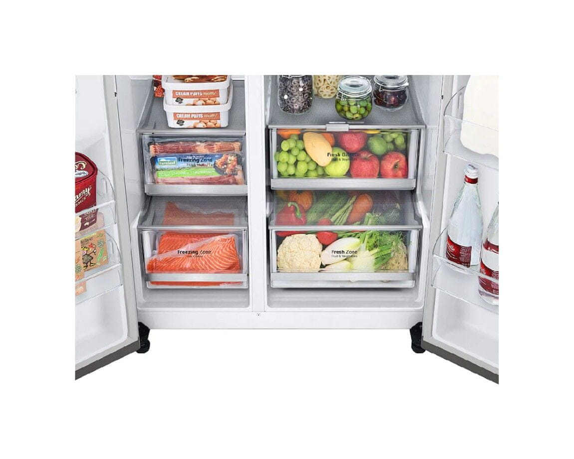 LG GSXV80PZLE ameriški hladilnik je neverjetno prostoren. V hladilnem delu ponuja 416 l, v zamrzovalnem pa 219 litrov prostornine. Tako boste lahko uživali v popolni organiziranosti in optimalnem odlaganju živil. Odlikuje ga linearni invertni kompresor LG, ki poskrbi za 32 % manjšo porabo energije in optimalen nadzor nad temperaturo, kar vaša živila ohranja sveža dalj časa. Dvakrat potrkajte in si oglejte 23 % več notranjosti hladilnika z InstaView Door-in-Door. Ameriški hladilnik s funkcijo LinearCooling™ omogoča ohranjanje svežega zraka vse do 7 dni.